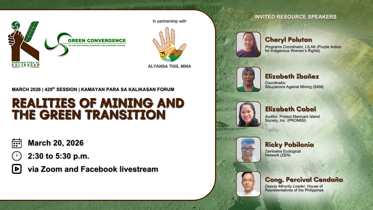 Green Convergence (GC), together with Alyansa Tigil Mina (ATM), convened the 429th Kamayan Para Sa Kalikasan forum themed “Realities of Mining and the Green Transition” on March 20, 2026, via Zoom and Facebook livestream.