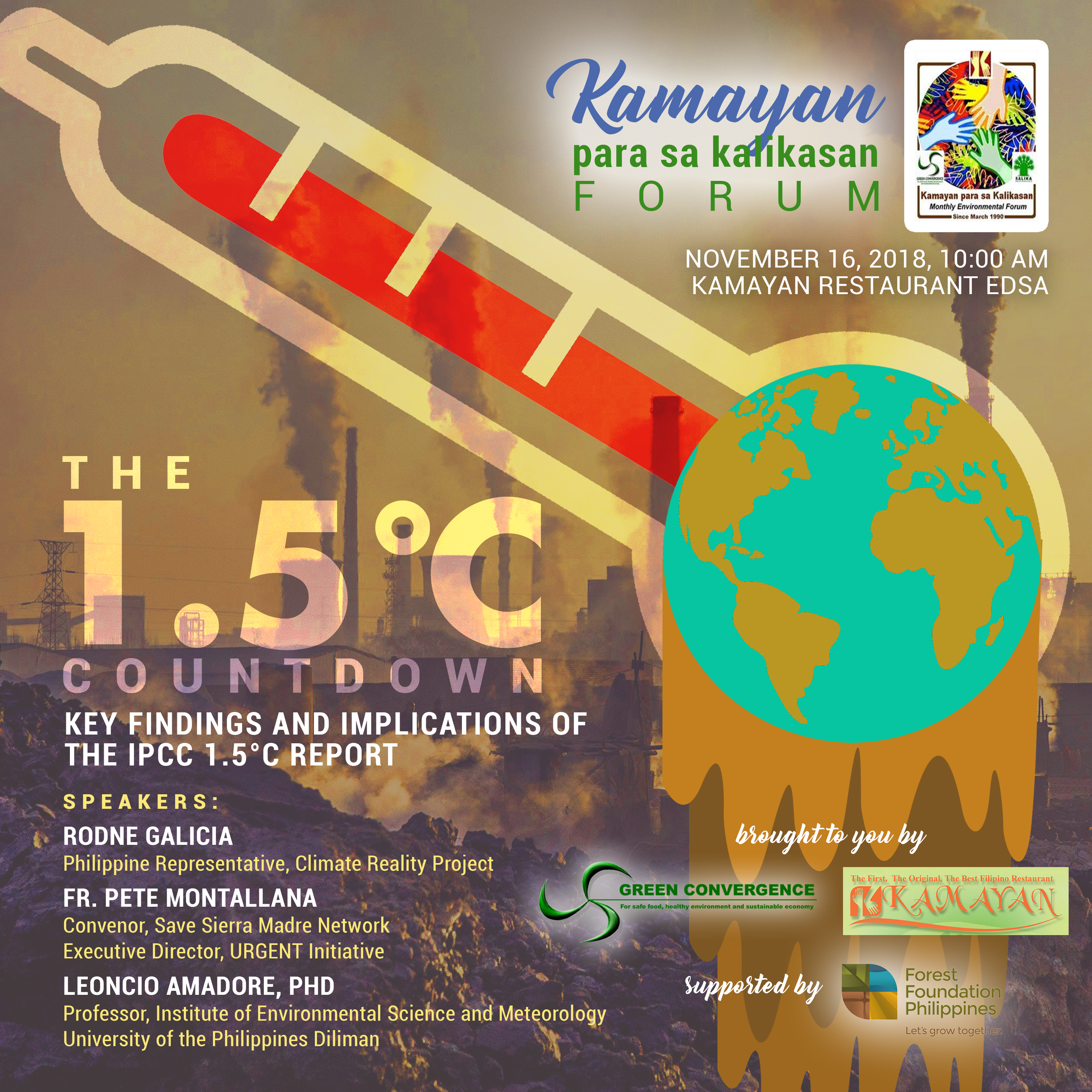 Learn more about it and participate in noteworthy programs to address Climate Change.  Attend the 344th edition of Kamayan Para sa Kalikasan entitled, “ The IPCC 1.5°C Special Report:  Key Findings & Implications, ” this November 16, 2018, 10:30 AM, at Kamayan EDSA.